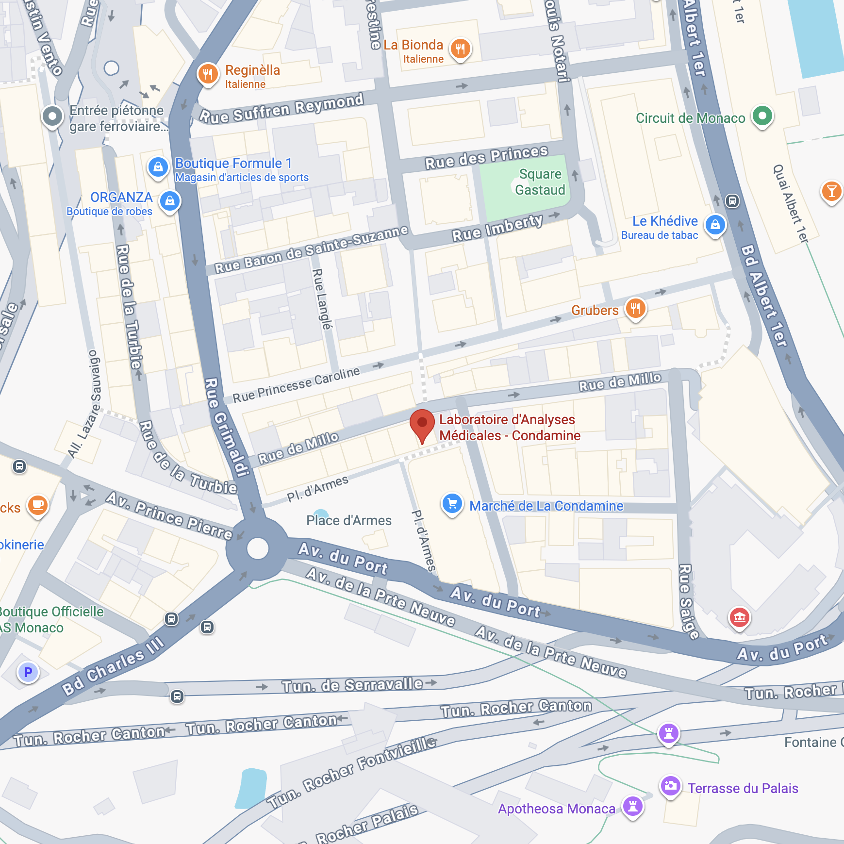 Le laboratoire de la Condamine se situe 13, place d'Armes, sous les arcades, quartier de la Condamine.